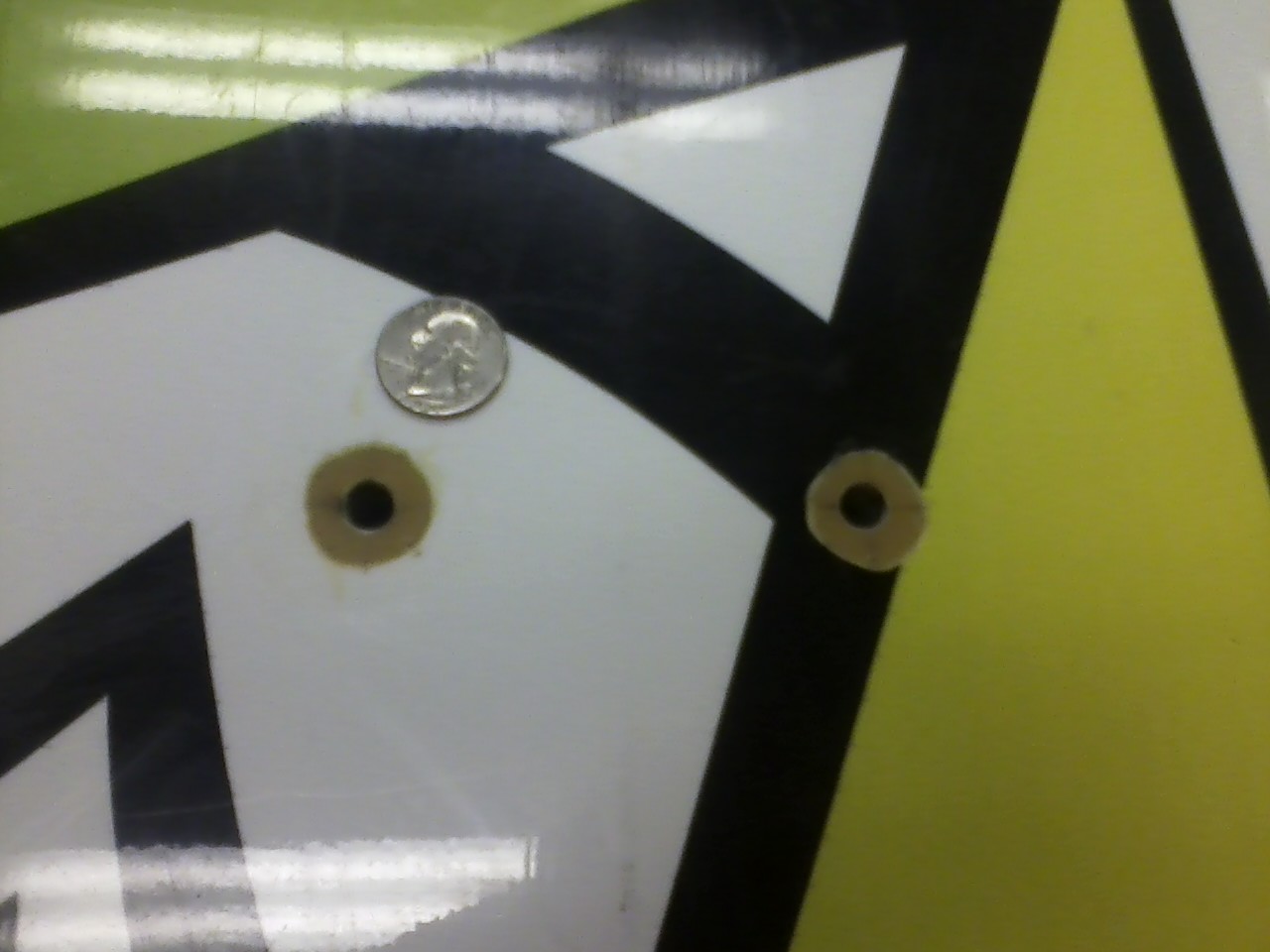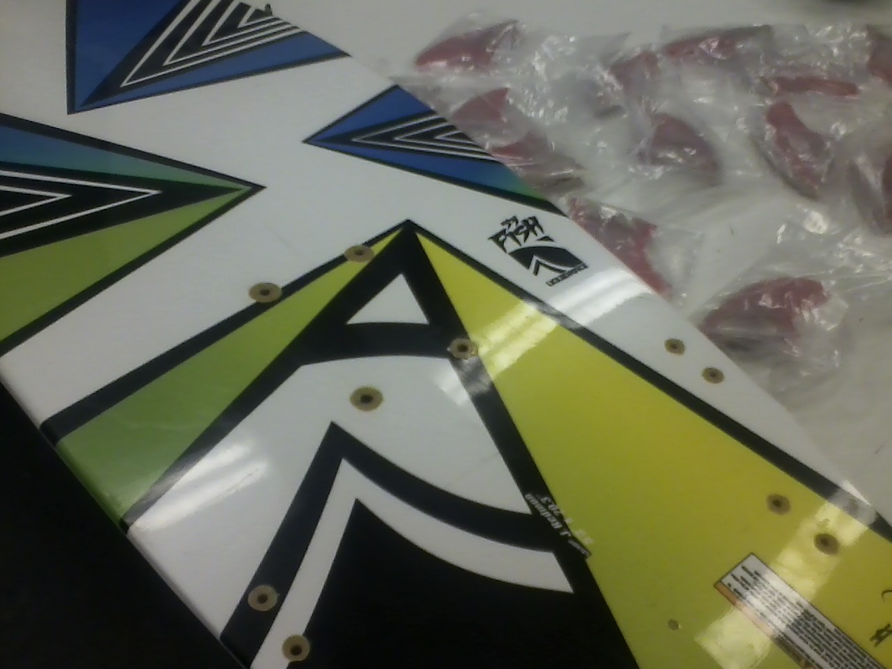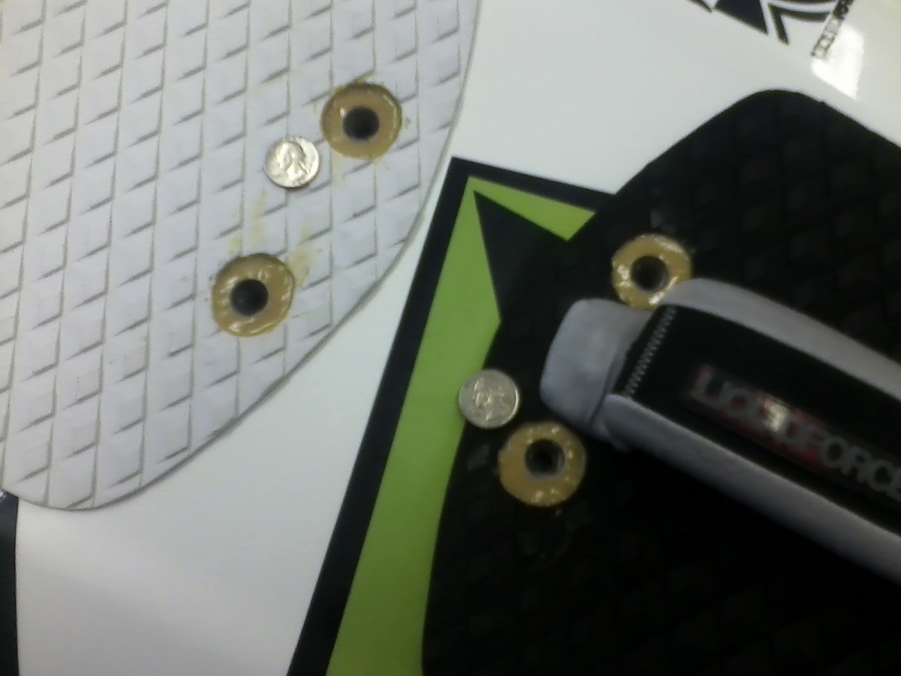 My hole locations are the same as was supplied to me from the retailer that I purchased the foil kit from (stock location). Once I have located exactly where the holes were to be, I drilled out to 3/8ths inch. From there, you use a die grinder (think Dremmel on steroids) with a carbide double cut bit to get your holes large enough. If you just keep drilling with larger sized bits, the bit will grab and you will crack the fiberglass on the top or bottom sheet. SO A DIE GRINDER IS NECESSARY! And do not use more than a 3/8-5/16th drill bit on this board or any board as you have the chance of causing some serious tearing/cracking. You can use pretty much any "Christmas tree" die grinder bit that is small enough at the tip to start making your drill holes bigger. Harbor Freight has a pretty good electric die grinder but it will thermal cut out on you if you use it when the air temp is high. A $20 "Christmas tree" carbide bit, that will do many more repairs, is needed to go with the grinder. You can find these at a construction tool supply place or somewhere like Fastenall. I do not like the grinding stones as they almost immediately clog up with gunk when used on plastic containing topsheets like on the Kitefish.