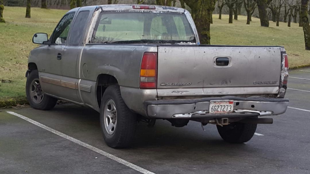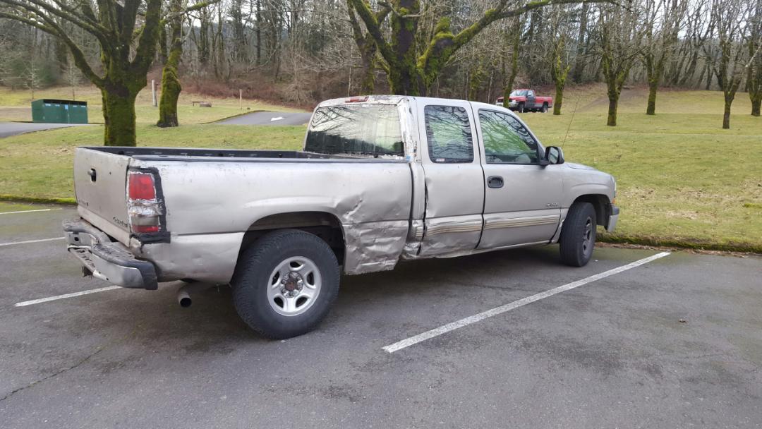 Vehicle of question Silver 2001 Chevy Silverado with dented side and rear california plate 6g27273 early 40's white male salt and pepper hair 150'lbs 5'8 missing two lower front teeth, of course.