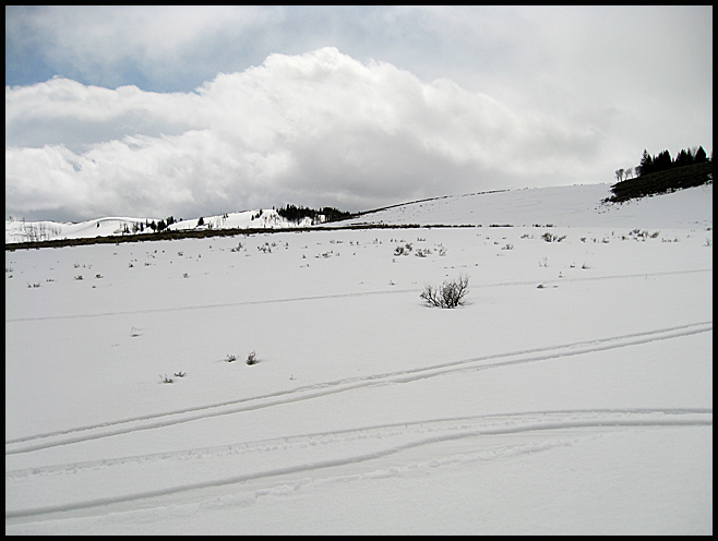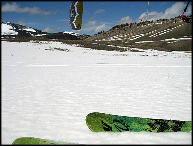 Every year I try to find a few new places to fly my kites. Sometimes my quest takes me to a dead end – no wind or no snow. Some days I score big time with perfect wind, deep snow and lots of sick terrain. These are the spots I come back to again and again and gloat about to my friends. Yesterday I was out kiting solo at a new spot, located in Yellowstone National Park that I had scouted last year. It’s a wild place with lots of big animals - wolves, elk, bison, and bears. Yesterday was also a gusty day – 20mph gusting to 35. Add to that yesterday’s hollow, sticky corn snow and it was far from ideal conditions.