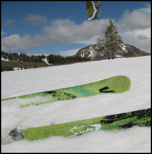 Nevertheless I threw up my 12m Manta2 and headed off into the wilds. At the beginning of my day, because so much melting has occurred, I had to follow ribbons of snow through the expanses of sagebrush. It was technical kiting and I didn’t always know if one ribbon was connected to the next ribbon. In spite of this, I made my way further and further from the road and deeper and deeper into the backcountry. Eventually I found the large snow fields that I had come for and spent the afternoon enjoying the powered conditions and spectacular scenery.