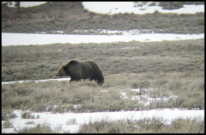 As the afternoon wore on, I eventually made my way back towards the road and was forced to roll up my kite and ski through a stand of timber. Upon emerging from these trees I immediately found another set of tracks, again Grizzly bear, but these tracks were fresh, very fresh, and large! Clearly defined in the spring corn snow were the bear’s pads and long claws. Looking around with hyper-vision it took me about 30 seconds to find the bear. About a quarter mile away among the sage and snow was a big brown moving Grizzly. As I watched this bear I could see it grubbing in the melted-out sage and soil. As it moved, the bear was slowly moving closer and closer in my direction. Because the wind blowing strong and towards me, there was no way this bear could hear or smell my presence. The last thing I wanted to do was surprise a mature Grizzly. With my kite I could have made fast time back to the road, but that route was also up wind and directly past the Griz. Instead, I retreated back into a nearby creek bottom and skied hard downwind and away from the bear. Again, the last thing I wanted to do was alarm the bear. Every so often, I would peak my head over the edge of the creek bank and check on this foraging bear, take a few photos and hightail it towards the highway! In the end, the Grizzly went one way and I went the other. Seeing this giant beast and kiting in such a wild place made for an awesome adrenaline filled day and another highlight of the winter.
