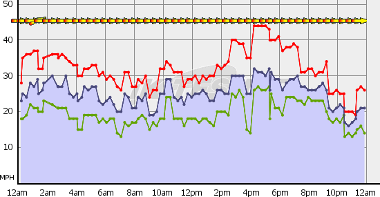 4pm 15mph to 45mph and that's at the sensor, on the water it was more like 10 to 35 or better.