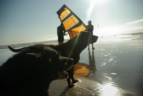 Thanks for the kind words. We miss her. Katie (foreground) with big Odis, Kim holding the kite and me winding lines at Manzanita. Photo by Kaela.