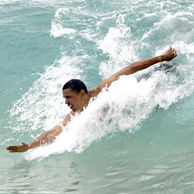 When I saw that pic, and his pretty good form in that wave, I knew we were in good hands. That's my criteria from now on. The Prez has to be able to bodysurf properly.