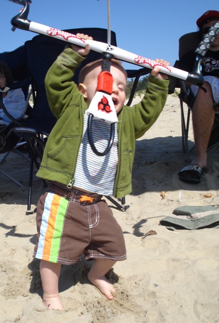 Finn was 3 months old in that picture at Kanaha. Now he is 15 months. He will be kiting by 4 or 5 years old. My 11 year old is close to getting on the board. We did a down winder yesterday with him. He had fun looping the 9m Smoke while being dragged downwind .....