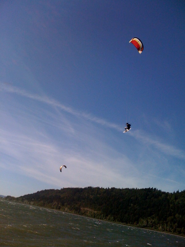 Assuming Shawn weighs 150#, the load on the kite would be almost 1500#!! If he's using 600# test line, both front lines would snap unless he was holding down 300# with the bar. Even if he was, any imbalance in the loading of the kite, like it turning, would snap a line.
