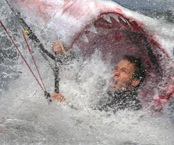 My wife's aunt got attacked by a shark while taking a picture of her familyon a beach down in Texas...not exactly kite related but has the bite marks to prove it.