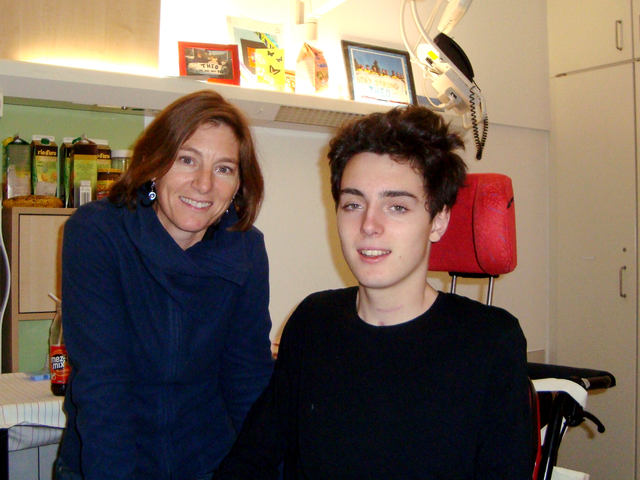 I went to visit Theo a month ago and he is working very hard, learning to navigate the halls in a new power wheelchair, and keeping spirits up with lots of visitors. He has his two signed kiteboards in the corner near him always.