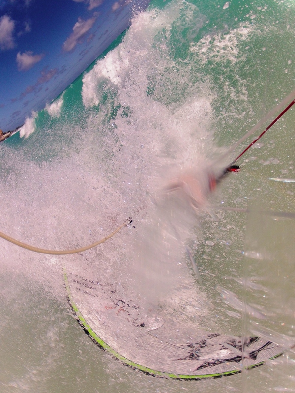 to minimize the water from getting on the lens, I tend to push the camera up the lines farther away from you. this prevents splash from hitting the lens. but yeah if you drop the kite, its gonna get wet