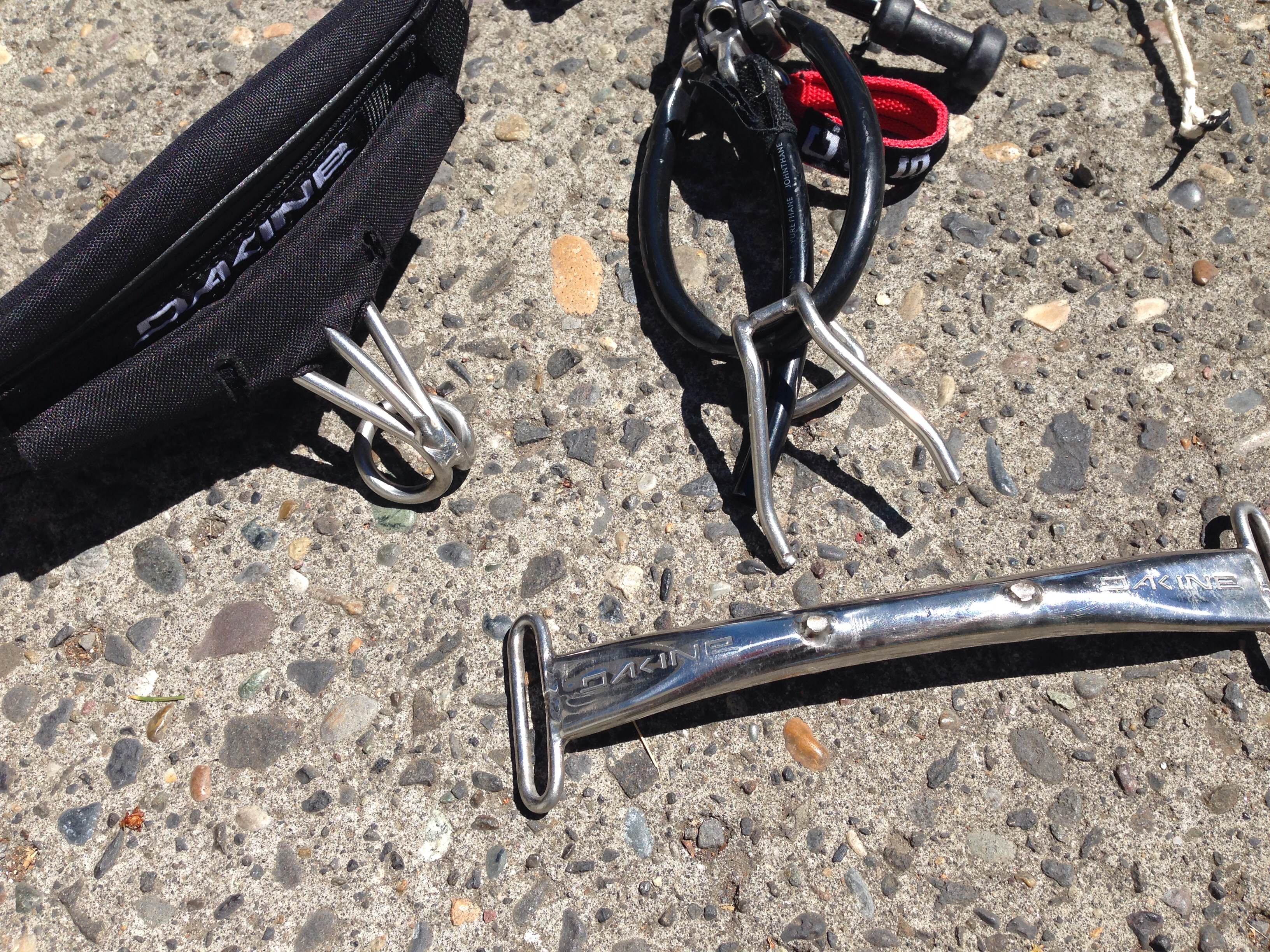 I am actually amazed at how all kite gear holds together considering the amount of force it constantly endures every session when we are getting "shot out of the cannon". I've blasted out 1 kite panel years ago but have never broken a bridle or line for that matter but I now have a wall collection of broken spreader bars that are generating conversations if Dakine is using a cheaper provider or if kites are becoming more user friendly and we are driving more power of out them???? I found an older triple bar hook I'll be using that seems beefier than DK's current standard two bar hook. See pic.