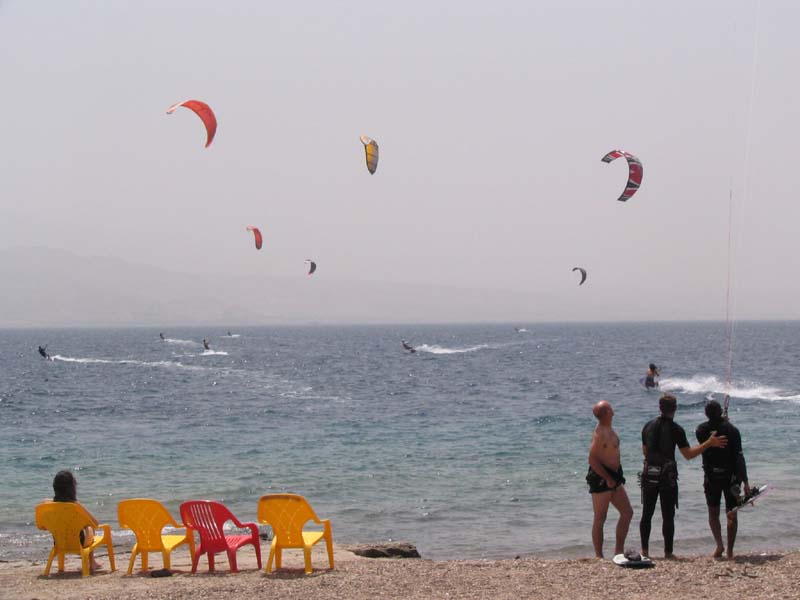 Here are some more. Eilat, on the Red sea, is crazy. The setup and launch site is about 25 by 30 meters with club med cottages on the downwind side and restaurant tables and stuff upwind. There are parasail boats going up and down right in front of the beach as well as glass bottom tourist boats. The guys seem content to sail past each other so close that I would be nervous even on windsurf gear. It is all way tight, but man is the water beautiful.