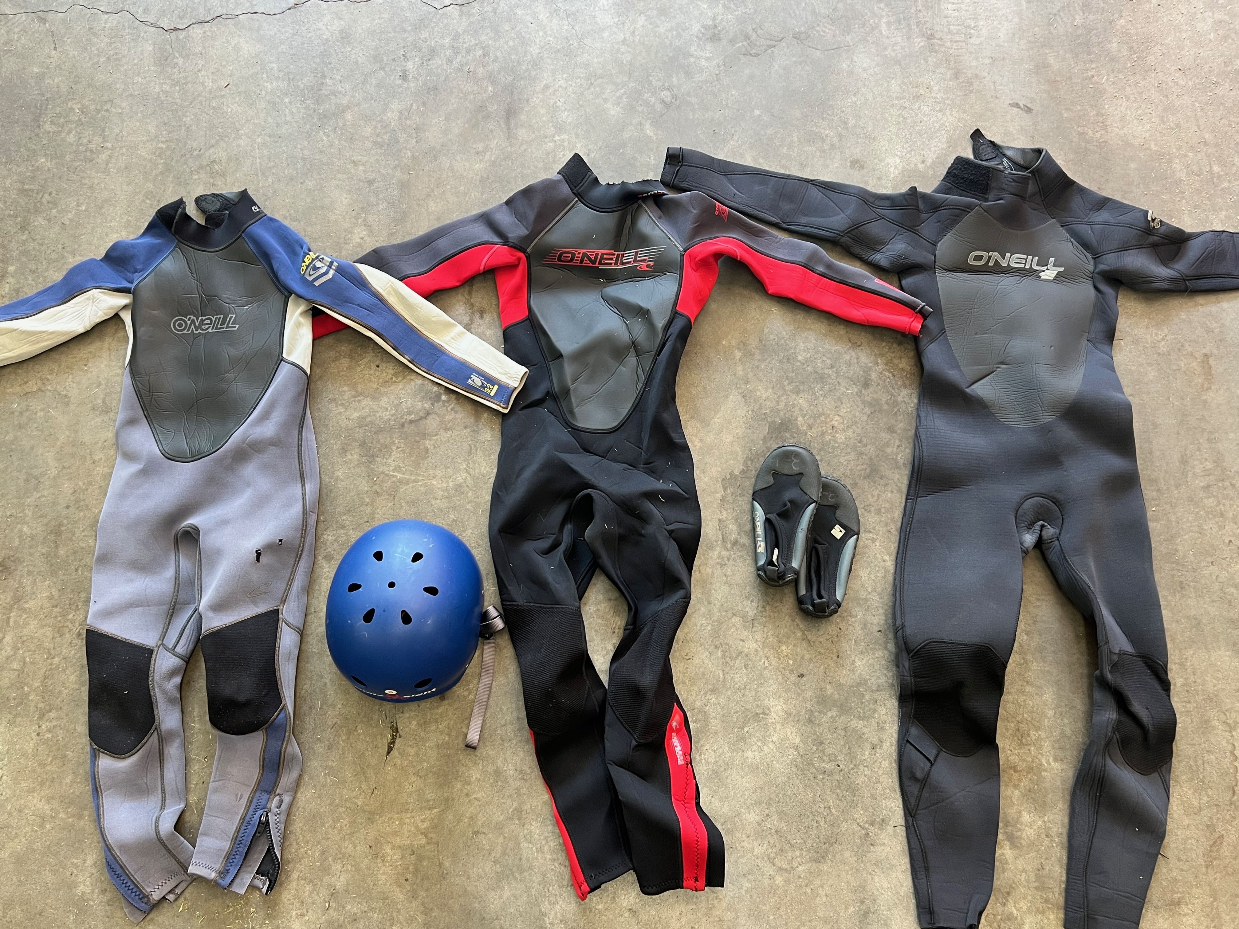 Sun Aug 24, 25 6:55 am Kids wetsuits size 8, 10, 12, helmet |