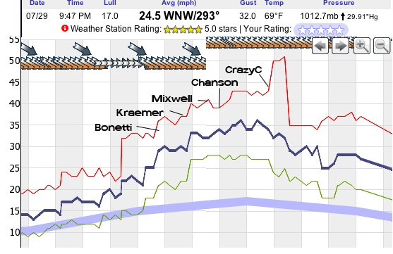 | Where did you get that wind graph.  I can't find one for Lyle on ikite.  I was over at Dougs around noon and the wind was super nukie.  Was putting the 5m up for Janet and everyone was like, maybe you should check it out first.  I am glad I did, because it was crazy.  I could barely hold down the 5m.