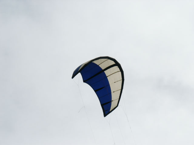 "Over the last 3-4 days JohnB and I have made substantial improvements to the Monostrut including 'dubbing' the wingtips, re-shaping the canopy profiles, adding inflatable wingtips and simplifying the bridle by eliminating the pulleys. The resultant size is about 8.5sq-m with a slightly lower AR and higher PA%. These changes have all produced a compact, simple and surprisingly stable kite with good turning speed, excellent upwind VMG and predictable handling. Today we had a 'public' session in Stevenson with winds around 20 knots. Most people were on 10-12 sq-m Revs, Sonics, Norths with an occasional 'C.' The Monostrut has a unique appearance and attracts interest presenting a mix of 'looks' from different perspectives being very flat looking from the rear and very 'C'-like from the front. Overhead it has a distinct Delta shape. At this point we are done with this sample and JohnB will be offering it to interested PacNW kiters for a tryout. "