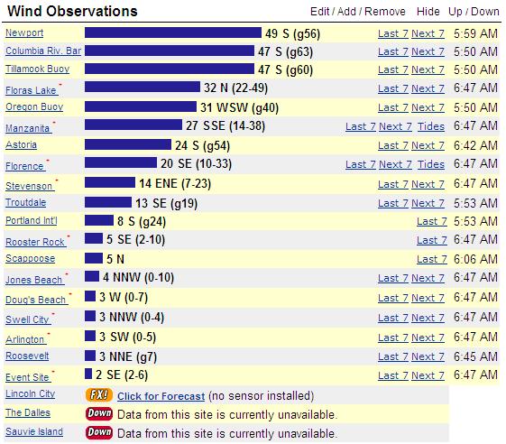I checked the aviation report for PDX; they've had gusts up to 46 mph... The sensor readings on Ikite and NWwind.net never showed the gusts because PDX did not report the gusts in the hourly wind reading since the gusts were isolated. The gusts were mentioned in the verbiage though. Something to think about... I was considering going to Frenchman's bar because the readings weren't that bad. The wind was light enough I might have been out on a 14m and then got hit with a 46mph gust.