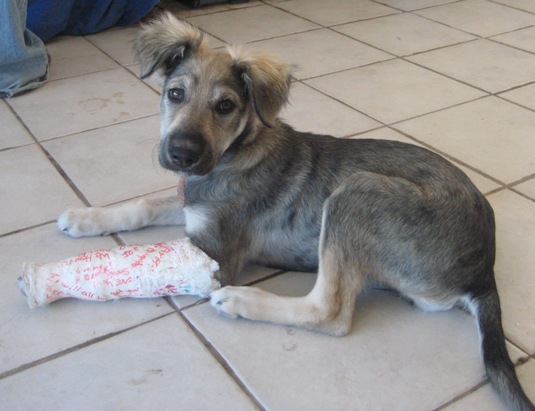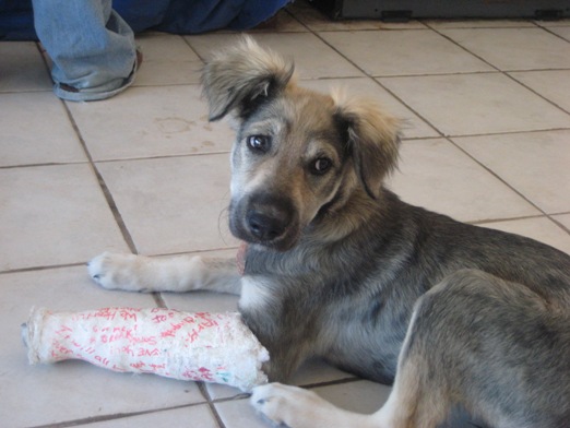 Don't be fooled by the cast on this 3 month old girl puppy, she is strong and playful. While playing with the bigger dogs one night, she got ran her over, leaving our little puppy with a fractured arm. We took her to the vet, got the X-rays, and the cast has to be on for 1 more week.