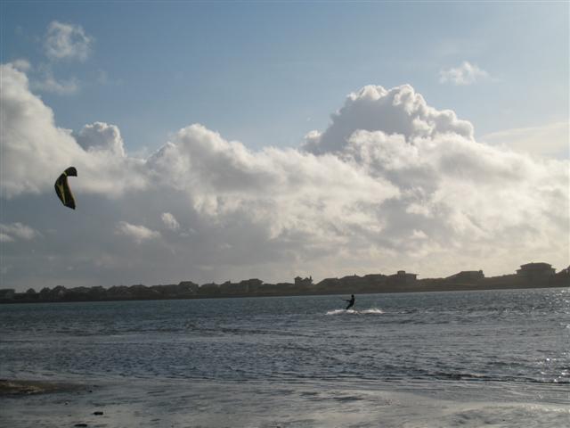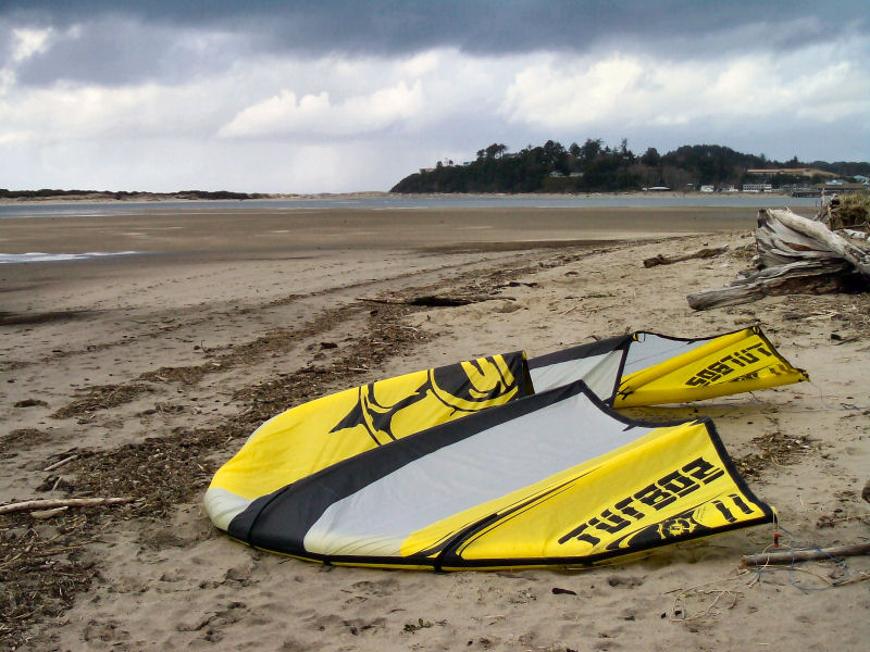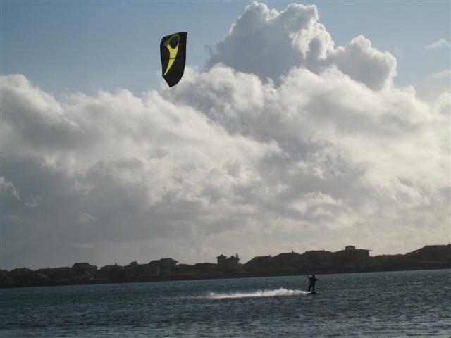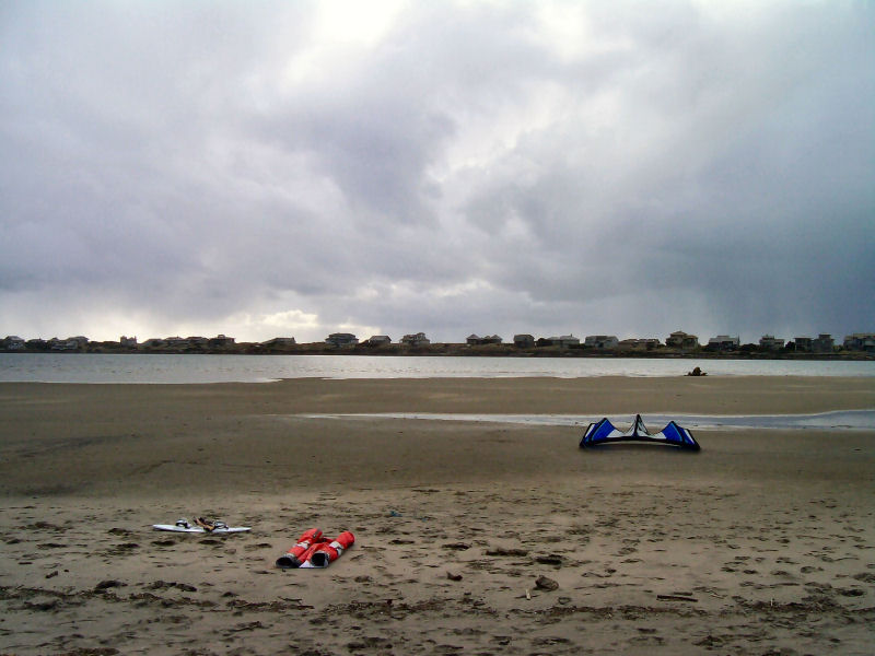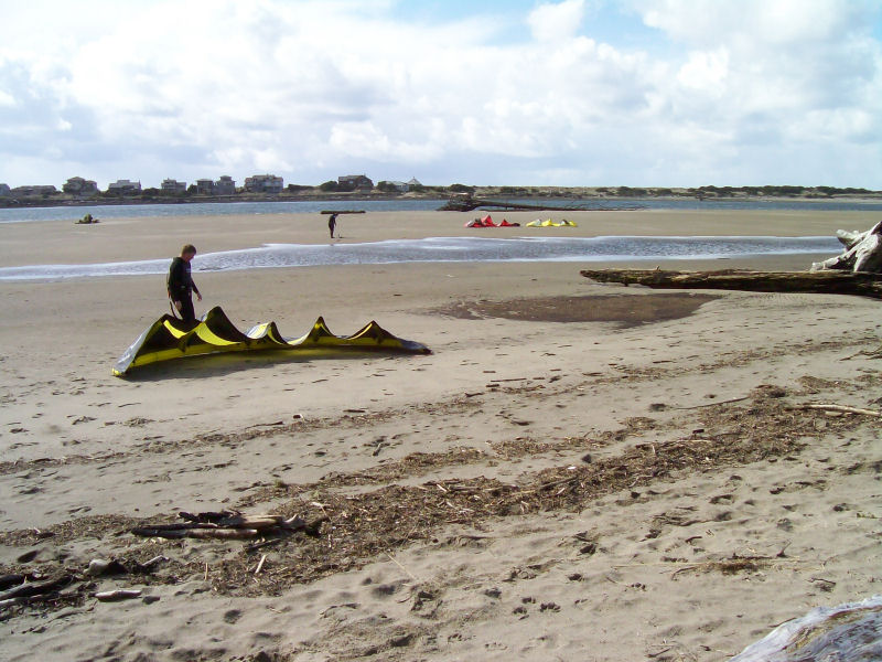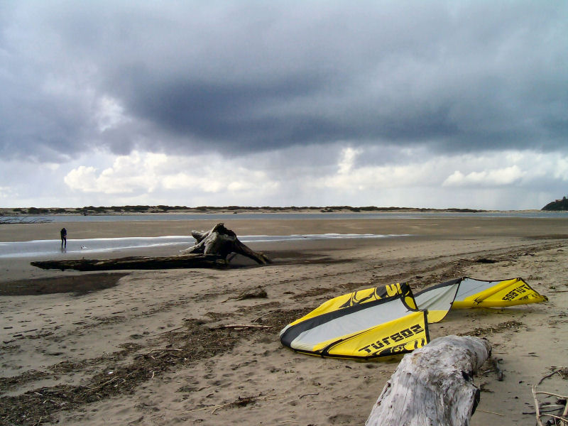 Snow on the pass on the way over, snow on road at the beach, but it was sunny almost all day!!! Westerlies 15-20, got hit by two major squalls w/ hail / snow in the 30+ range. Kind of exciting being that we all had our bigger kites up. Air was 44.5 F & water was 47.5 F - pretty warm considering it was snowing in the hills not 200 feet above us!