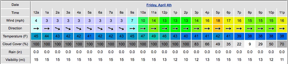 NOAA HR Forecast: Friday: Showers likely, mainly after 11am. Mostly cloudy, with a high near 58. West wind 10 to 13 mph increasing to between 18 and 21 mph. Winds could gust as high as 31 mph. Chance of precipitation is 70%.