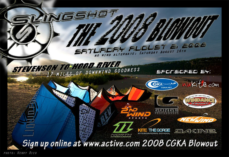 The 2008 Blowout is scheduled for Saturday August 2nd with an alternate (no wind) date of Saturday August 16th. The 17 mile down wind kiteboarding race/fun run will start in Stevenson, WA. and end in Hood River, OR.